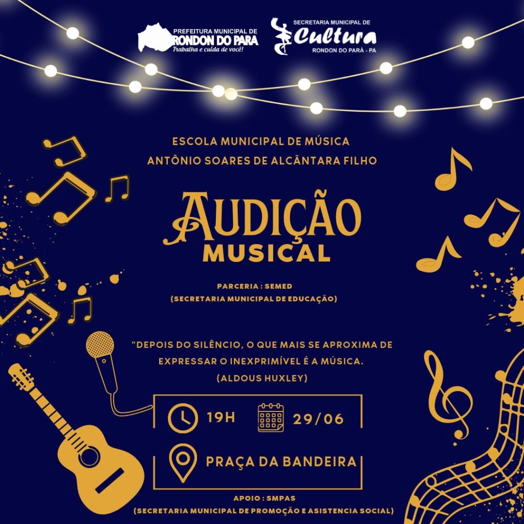 A Prefeitura Municipal de Rondon do Pará, promove através da Secult, a Audição Musical, um evento de valorização do aprendizado dos alunos da Escola Municipal de Música Antônio Soares de Alcântara Filho. O evento será um show de revelação de talentos.