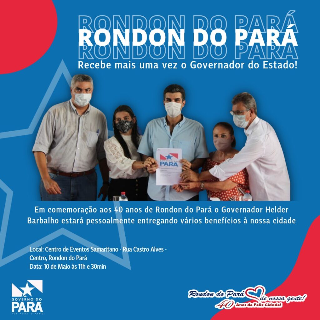 Nesta terça-feira dia 10 de Maio abrindo as comemorações dos 40 anos de nossa cidade, teremos a presença ilustre do Governador do Estado Helder Barbalho, mais uma vez em Rondon do Pará.
