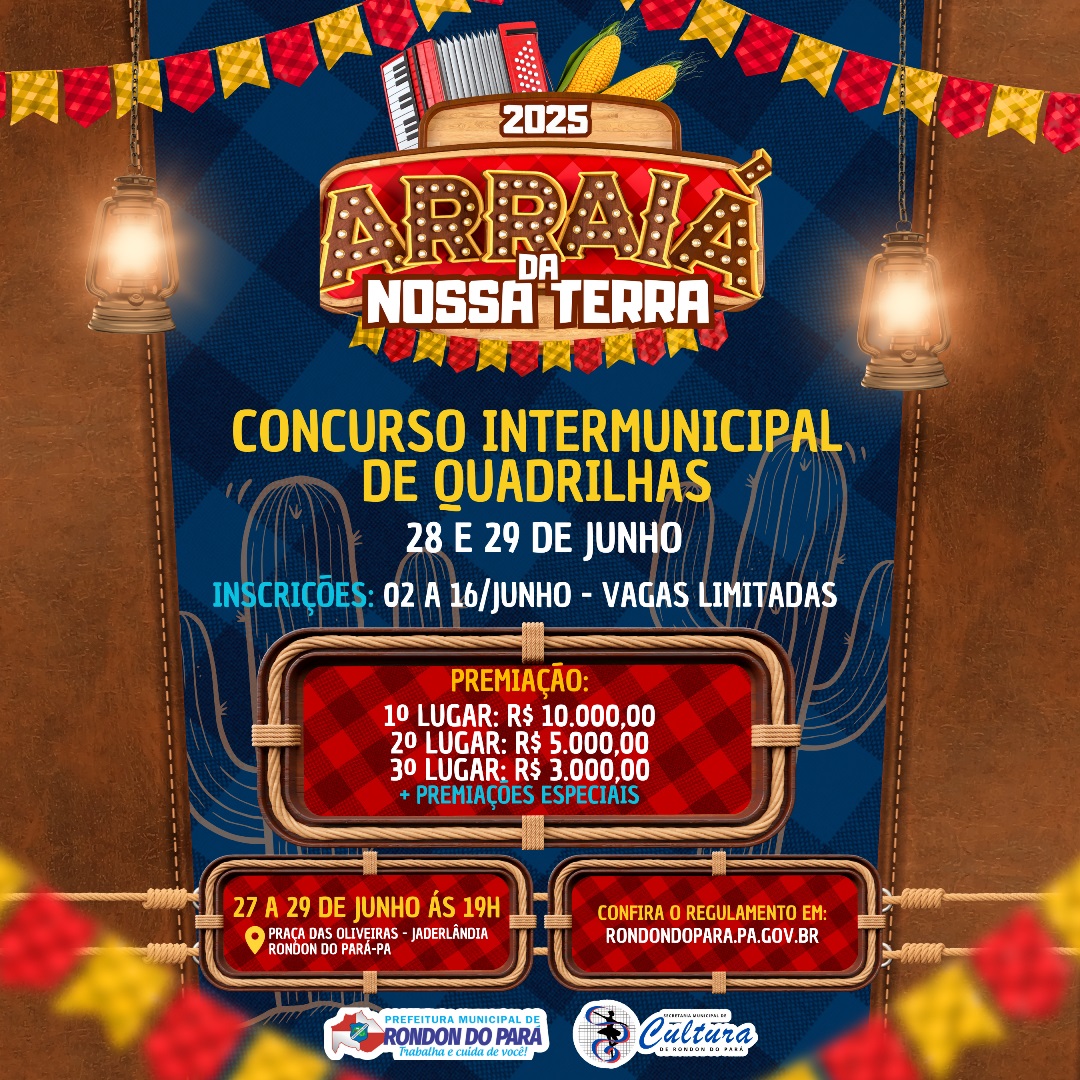 A Secretaria Municipal de Cultura, Turismo e Juventude, no exercício das suas atribuições, torna público o regulamento do festejo junino 2025 – Arraiá da nossa terra, que tem por finalidade valorizar, difundir e incentivar uma das mais populares manifestações culturais brasileiras, a festa junina.